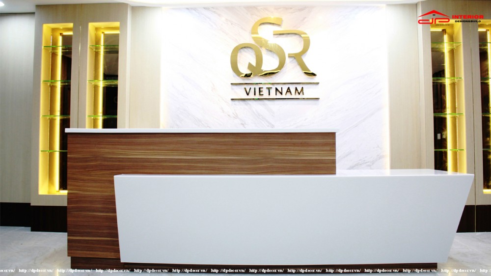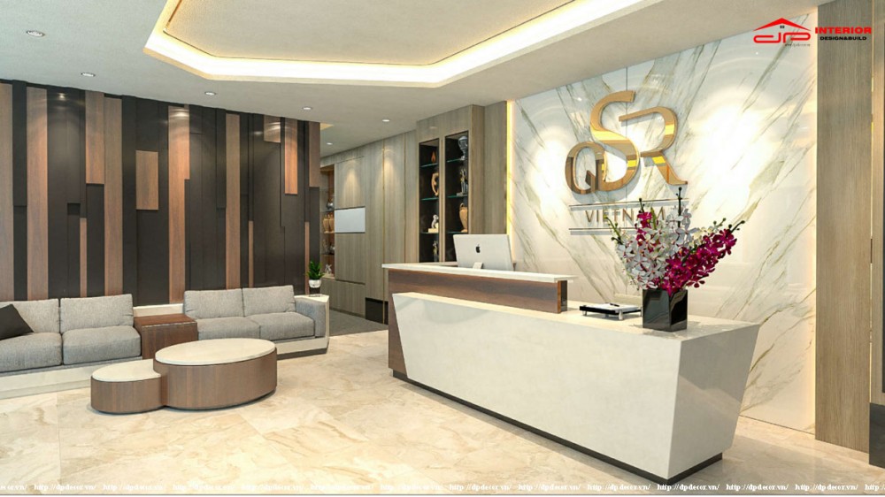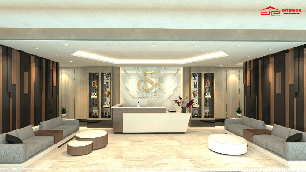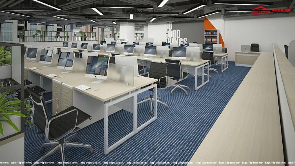 Đội ngũ thiết kế Dp Decor cố gắng tối giản mọi thứ xung quanh, để thu hút sự quan tâm của người sử dụng vào điểm tương tác ở vị trí trung tâm, đây cũng là ý đồ của phương pháp tối ưu hóa chi phí đầu tư, team thiết kế đã nghiên cứu và phân bổ đều các khu vực chức năng trong văn phòng, các diện tường khu vực sảnh đón lễ tân được thiết kế đầu tư làm điểm nhấn, gây ấn tượng cho khách hàng và người sử dụng, các khu vực văn phòng làm việc sử dụng hệ thống trần mở, kết hợp đèn thả và phối thảm đa dạng, mang lại cảm giác hiện đại và không bị nhàm chán.