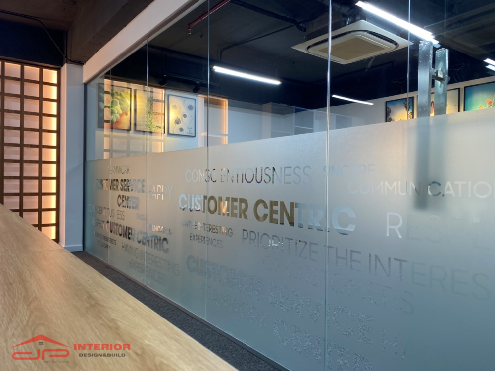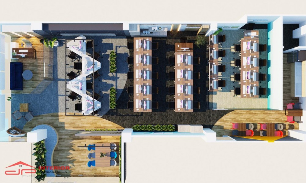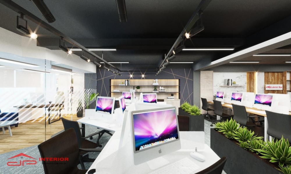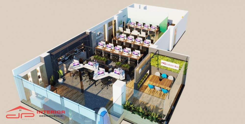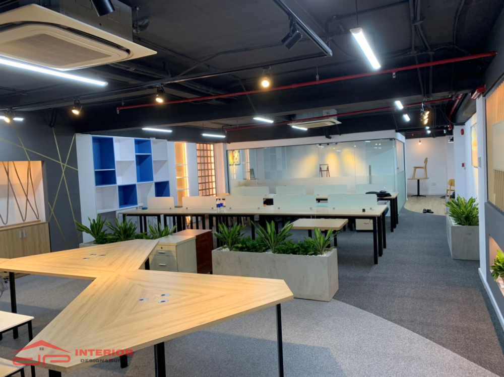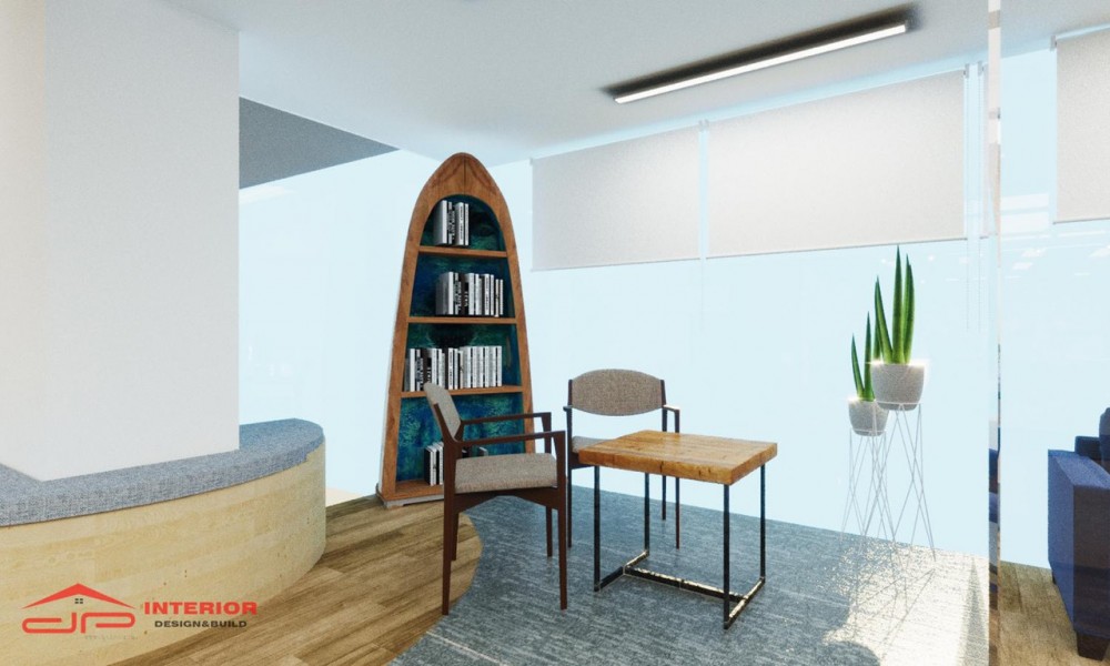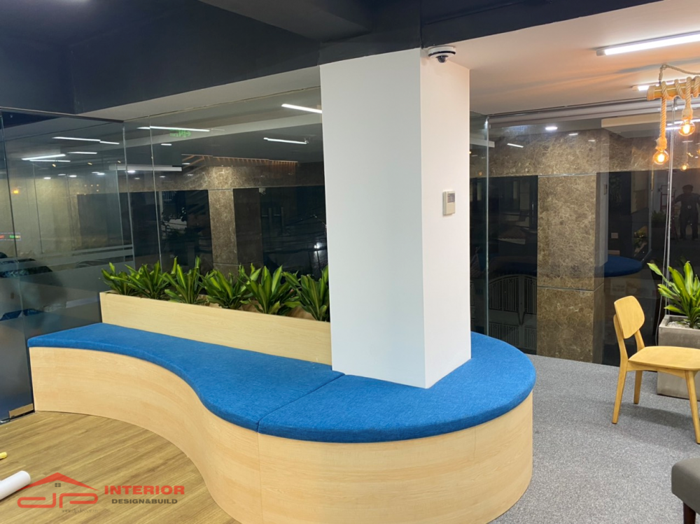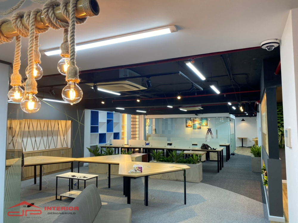 Với phương châm tạo môi trường làm việc năng động, hiệu quả tốt nhất cho nhân viên, văn phòng được thiết kế với đầy đủ công năng sử dụng khu: khu vực đọc sách, khu relax, pantry. Màu sắc chủ đạo của văn phòng sử dụng màu xám, kết hợp hệ thống trần mở, mang lại công gian làm việc trẻ trung, độc đáo. Bên cạnh đó, các chi tiết decor cũng được trao chuốt như bộ sofa băng tạo dáng hình gợn sóng, thảm cuộn trải sàn ghép mí bằng những đường cong. Các mảng xanh cũng được khai thác làm cho văn phòng trở nên tươi mát, mang đến cảm giác gần gũi với thiên nhiên. Hoà quyện với thiên nhiên làm cho năng suất làm việc của toàn bộ anh chị làm việc trong toà nhà trở nên năng suất hơn nhiều lần.